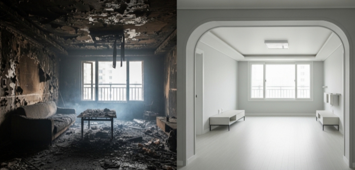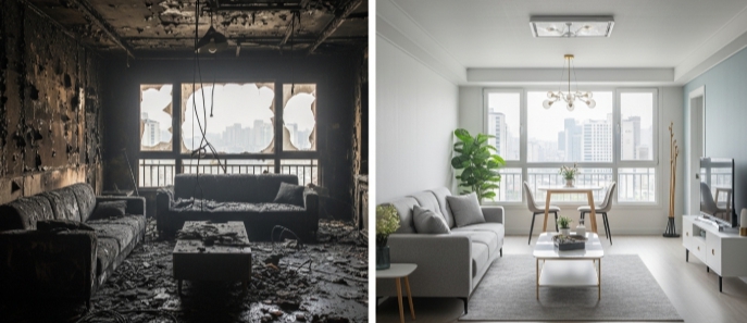 화재 후 가장 힘든 것이 탄내와 그을음입니다. "청소해도 냄새가 안 없어져요." 제대로 제거하지 않으면 1년이 지나도 냄새가 남습니다.