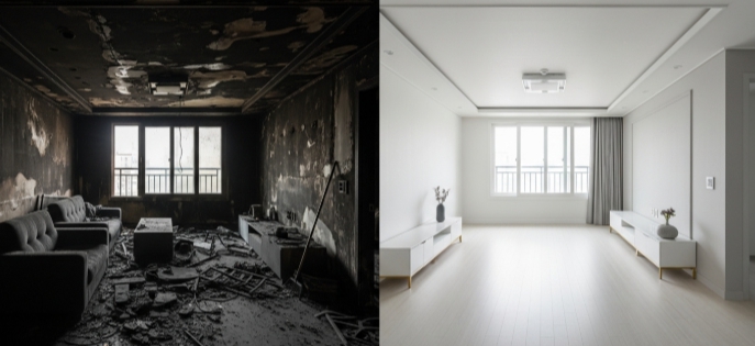 사실, 집이나 공장 등 소중한 공간의 피해 사실이 인터넷에 노출되는 것을 불편하게 느끼는 고객님들이 대부분입니다. 저희는 이러한 고객님의 요청과 입장을 존중하여, 블로그에 사용된 대부분의 복구 사례 사진은 실제 현장 데이터를 바탕으로 AI 기술을 활용하여 재현했음을 알려드립니다. 이미지는 참고만 해주세요.