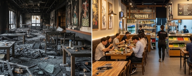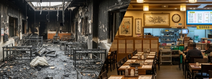 서울시 성동 성수동에 위치한 4층 건물 1층 일식당에서 발생한 화재는 지난 5월 말이었습니다. 주방 튀김기 과열로 시작된 불은 주방 전체를 태우고 2층 사무실까지 연기가 확산되었습니다. 오후 8시, 영업 중이던 홀에 손님 20명이 있었고 긴급 대피해 인명 피해는 없었지만, 1층 전체와 2층 일부가 심각하게 손상되었습니다.