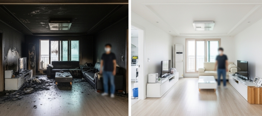 사실, 집이나 공장 등 소중한 공간의 피해 사실이 인터넷에 노출되는 것을 불편하게 느끼는 고객님들이 대부분입니다. 저희는 이러한 고객님의 요청과 입장을 존중하여, 블로그에 사용된 대부분의 복구 사례 사진은 실제 현장 데이터를 바탕으로 AI 기술을 활용하여 재현했음을 알려드립니다. 이미지는 참고만 해주세요.