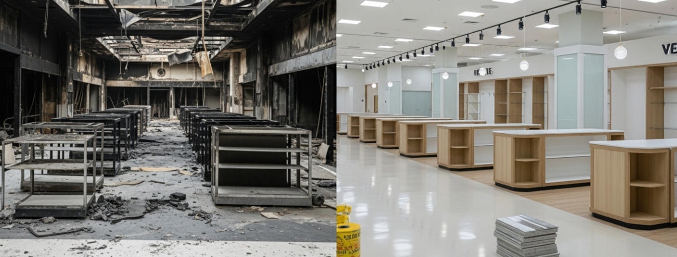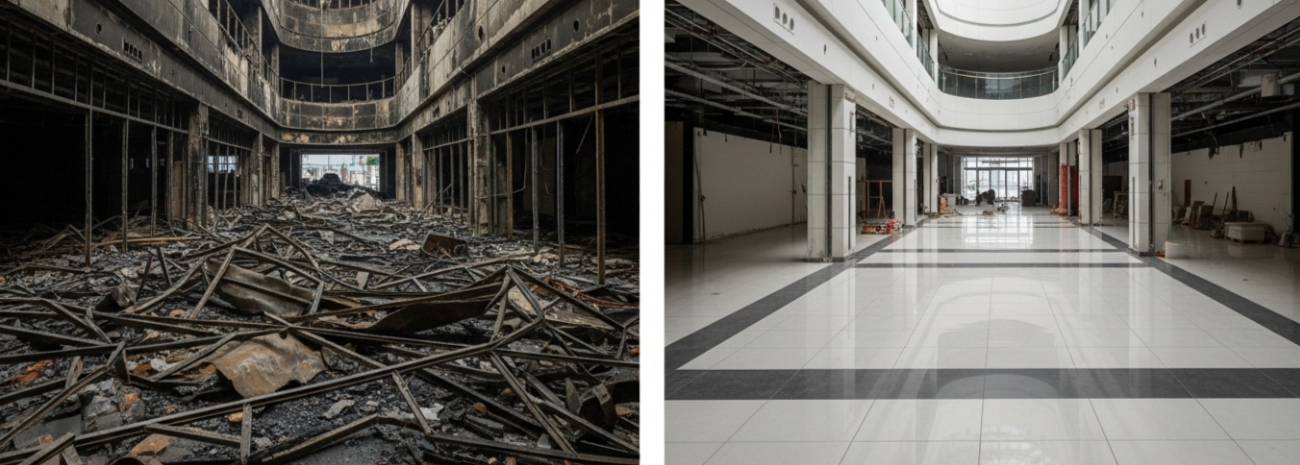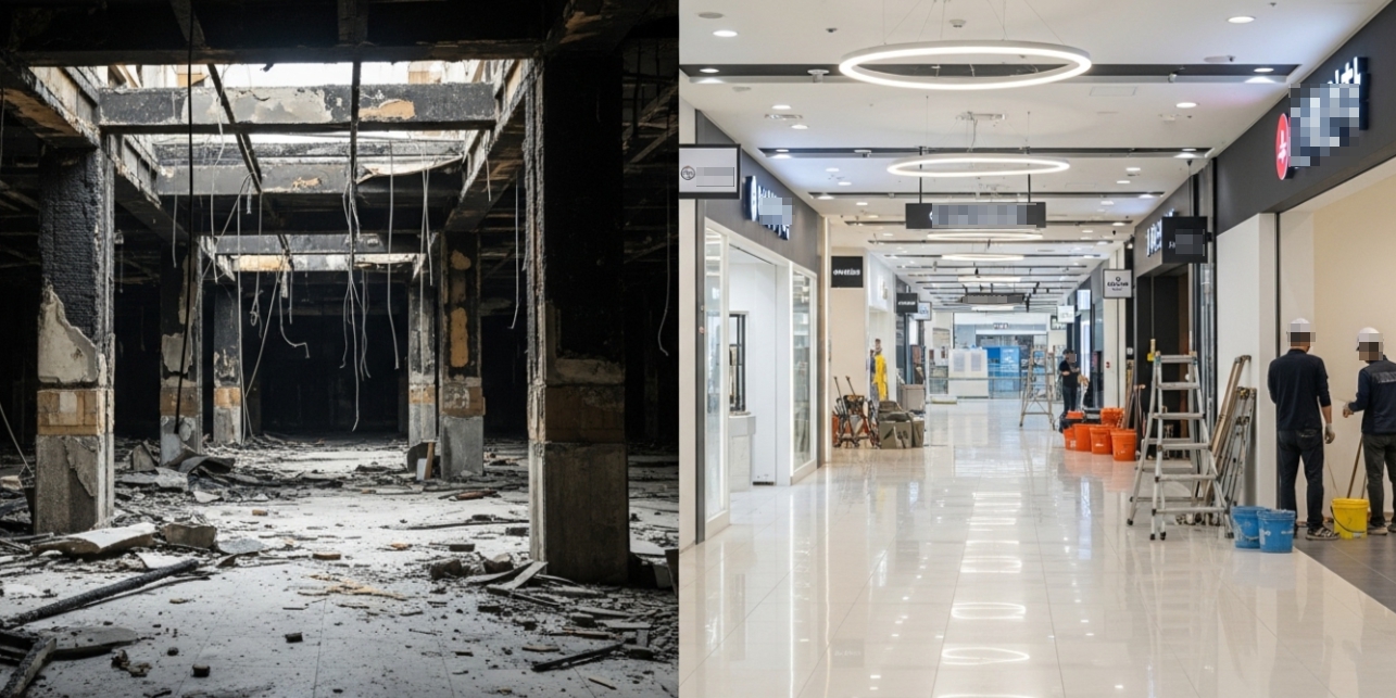 상가 화재 복구는 그을음 제거부터 시작해 구조 안전 확인, 전기·소방 시설 재설치, 위생 기준 충족까지 요구되는 고도의 전문 작업입니다.