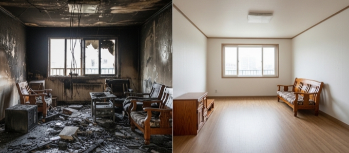 철거가 완료된 공간은 눈으로는 깔끔해 보여도 미세한 그을음과 냄새가 남아 있습니다.