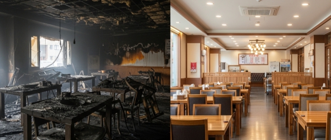 지난 8월 하순, 서울시 종로 인사동에 위치한 한정식 전문점에서 오후 2시경 주방 가스레인지 과열로 인한 화재가 발생했습니다. 점심 영업 직후 발생한 화재로 초기 진압은 신속했으나, 주방 전체와 홀 일부에 그을음이 확산되었고 소화 작업 중 발생한 소화수로 인해 목재 인테리어와 한지 벽면까지 복합 피해가 발생했습니다.